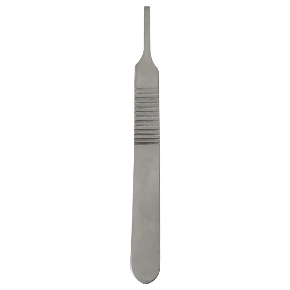 An interchangeable handle of a scalpel designed to mount a compatible blade. Together, this device and the blade, become a single-bladed surgical instrument used for cutting or dissecting tissue.