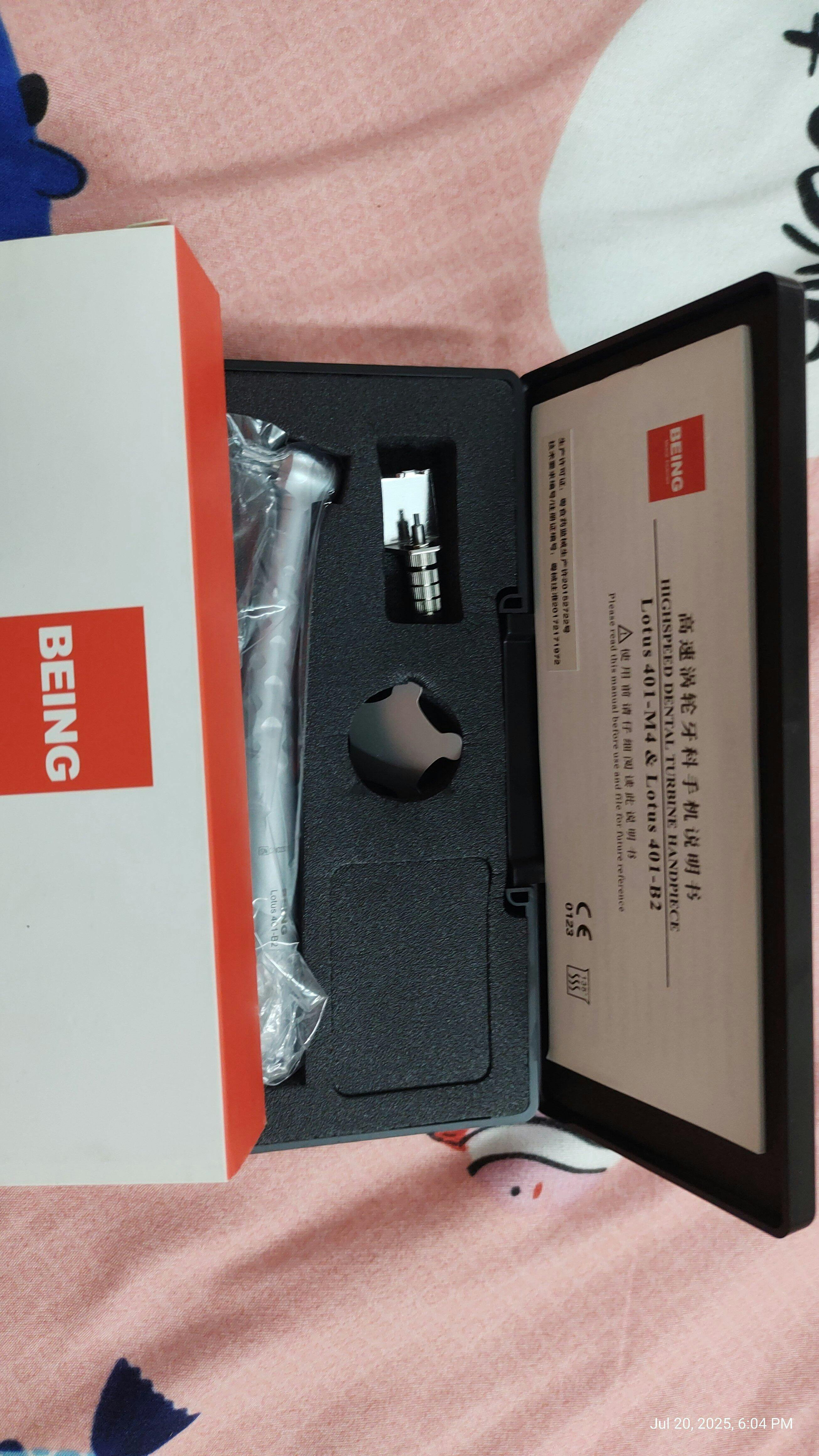 Answer: Certainly, the Being Foshan Airotor Handpiece is provided in a box, and it typically includes essential accessories such as an airotor bur wrench and a head cap wrench within the packaging.