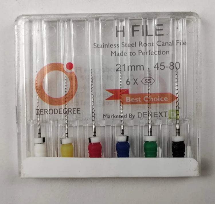 Denext Zero Degree Stainless Steel (SS) H Files are advanced endodontic instruments meticulously crafted to elevate the precision and effectiveness of root canal procedures. Developed by Denext, a leading name in dental instrumentation, these H Files feature a zero-degree design for enhanced access and maneuverability in challenging root canal anatomies.
