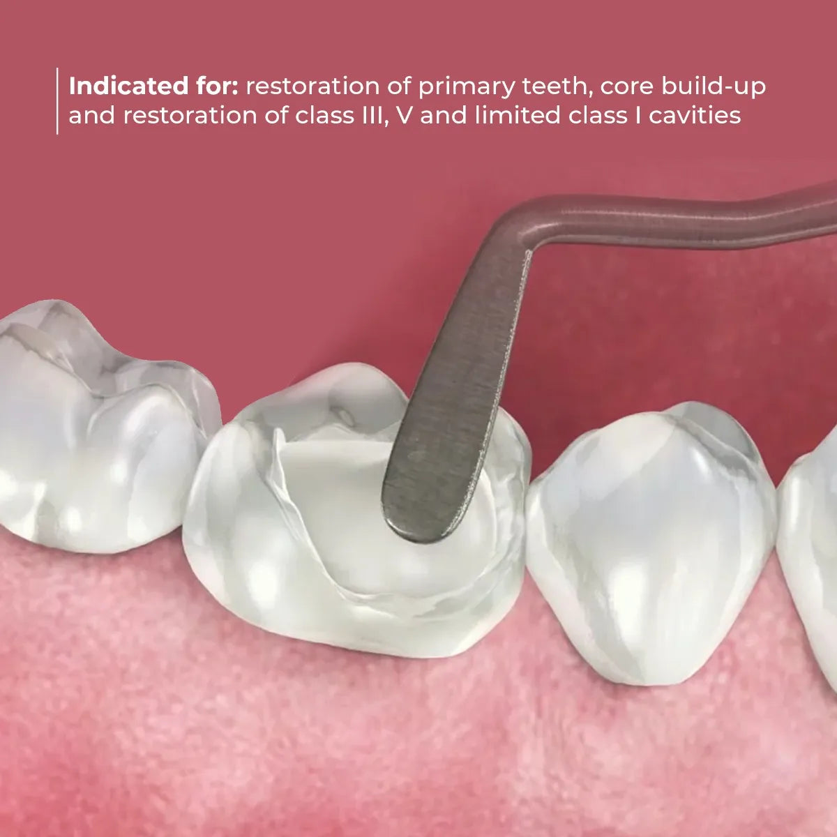 Indications : Restoration of primary teeth, restoration of class III, V and limited class l cavities