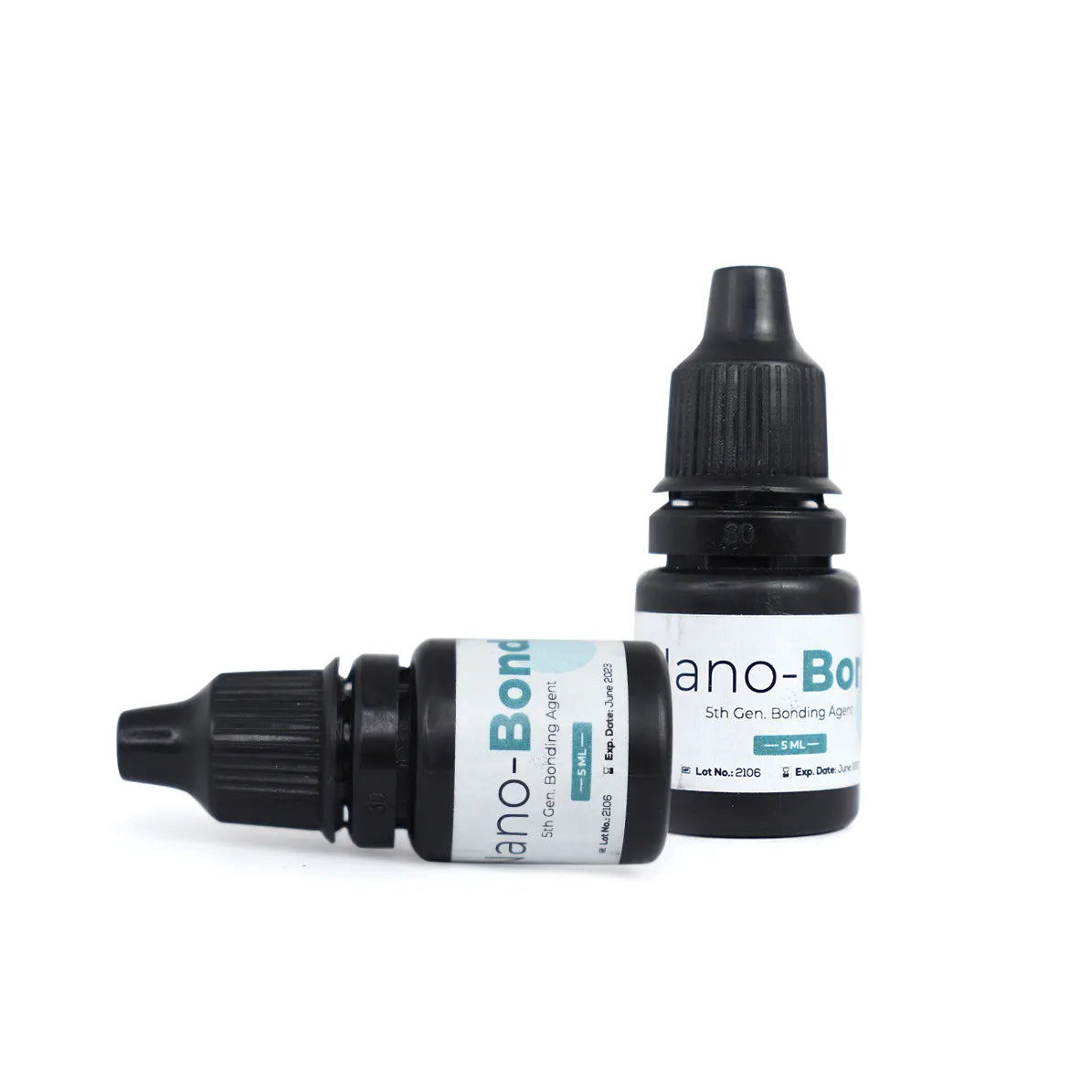 - Adhesive : Immediately after blotting, apply 2-3 consecutive coats of Nano-Bond to etched enamel and dentin for 15 seconds with gentle agitation using a fully saturated applicator. Gently air thin for 5 seconds to evaporate solvents. Light cure for 20-30 seconds.