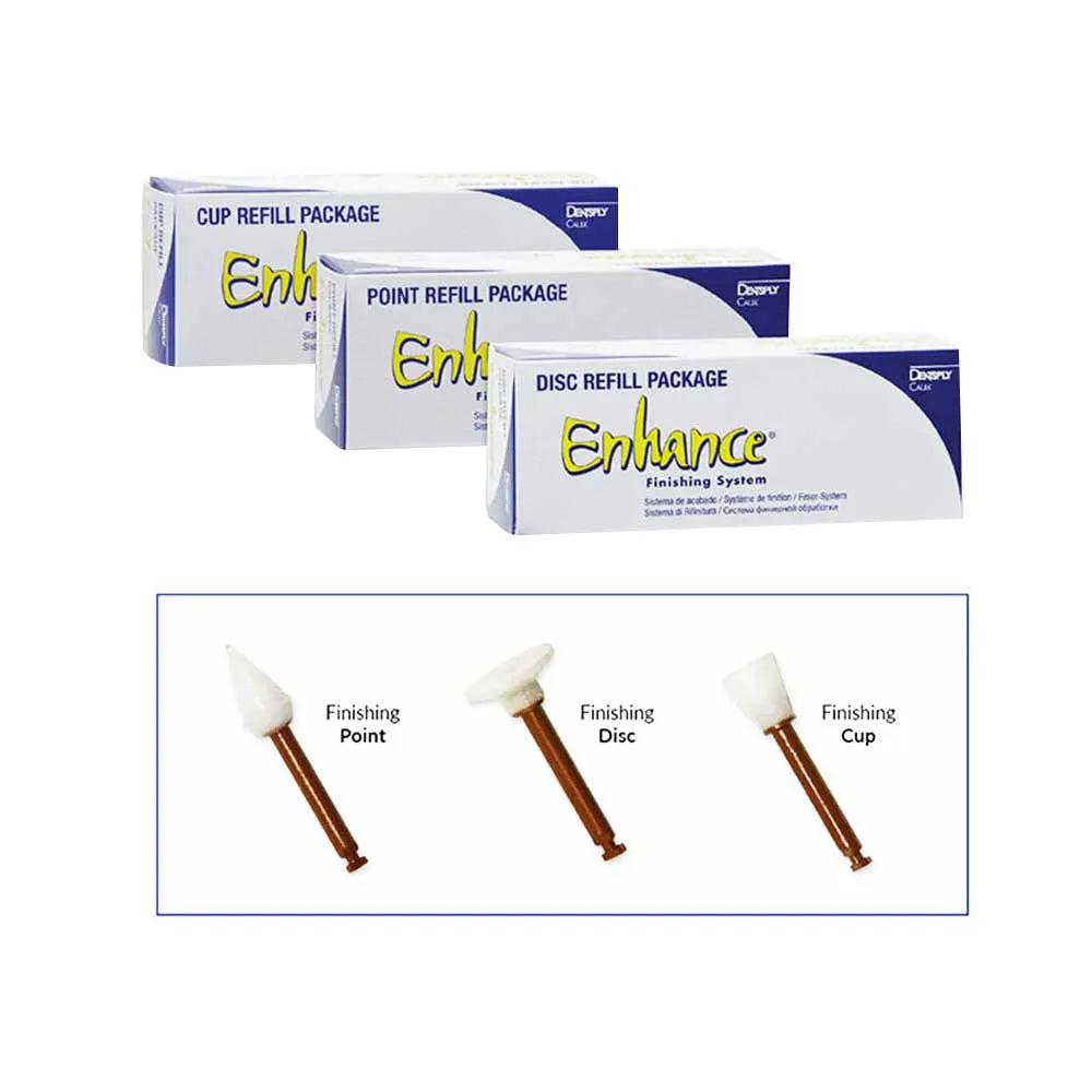 The Dentsply Enhance Finishing & Polishing system is a comprehensive solution specifically designed for the finishing and polishing of composite restorations in dentistry. It is a versatile system that effectively buffs the surface of the restoration, resulting in a smooth and well-contoured finish.Using the Enhance system is a straightforward process. As pressure is applied during the polishing procedure, the abrasive particles within the cups, discs, and points disengage, allowing them to effectively buff the surface of the composite restoration. This mechanism ensures that the restoration achieves the desired smoothness and contour.The Enhance system is designed to be highly effective in achieving optimal results while being user-friendly for dental professionals. It offers a range of cups, discs, and points that cater to various contours and areas within the restoration, ensuring versatility and precision during the polishing process.