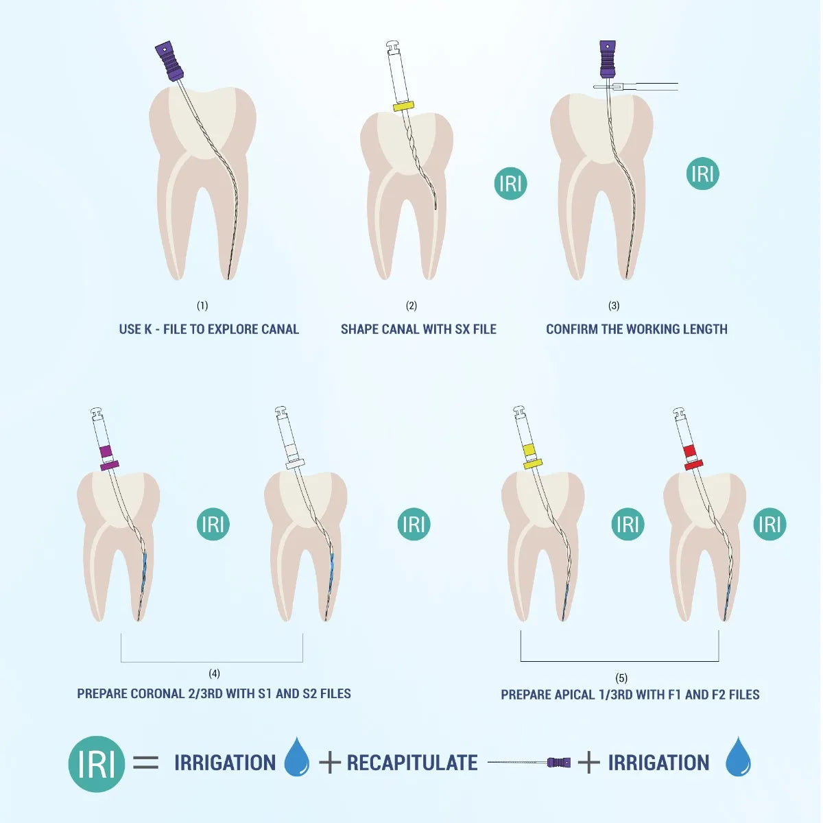 - Finalization: Once the desired canal shape and size are achieved, complete the root canal procedure by thoroughly cleaning and shaping the apical portion of the canal. This may involve using smaller hand files or specialized instruments.
