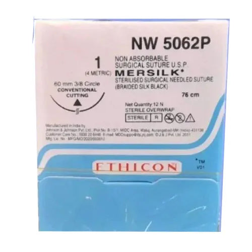 Ethicon Mersilk #1 Black Braided Suture - NW5062P is a medical-grade surgical thread renowned for its vital role in various procedures. Its distinguishing feature is its black color, which enhances visibility against tissue during surgeries. This high-quality suture boasts excellent tensile strength and knot security, minimizing the risk of postoperative complications. The braided design ensures flexibility, making it ideal for intricate suturing tasks. Widely trusted for its durability and tissue compatibility, the Mersilk Black Braided Suture is indispensable in modern surgical settings. It aids surgeons in achieving precise wound closure, promoting faster healing. As with all medical products, following manufacturer guidelines and healthcare professionals' advice is essential for safe and effective usage. Product specifications may change, so staying informed with up-to-date information is crucial.