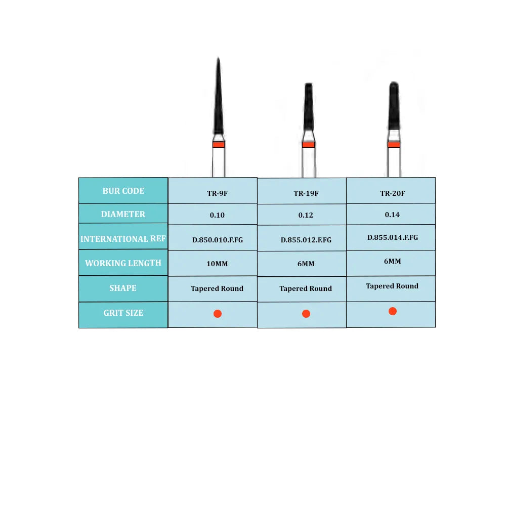 Frank Dental Tapered Round End (TR) Fine Grain Diamond Burs (made in germany) are manufactured from the highest quality steel shanks using exquisite fine natural diamonds to match international specifications. This advanced manufacturing, using computer controlled precision engineering, ensures true concentricity and balance, minimising vibration and potential damage to handpiece bearings and at the same time improving cutting efficiency and product longevity.