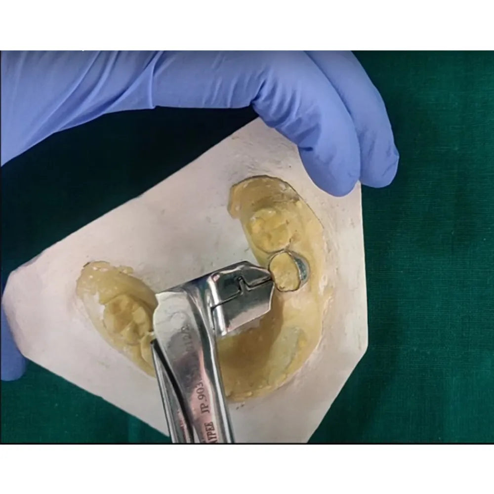 It is used for pinching the band while preparing the tooth. Contour fitting to the side of a tooth is aided by the concave surface or depression at the outer ends of each of the band clamping portions. The purpose of the elevated edge is to provide a friction contact with a portion of the material of the strip to prevent it from slipping in the use of the plier in the operation of forming a band around a tooth