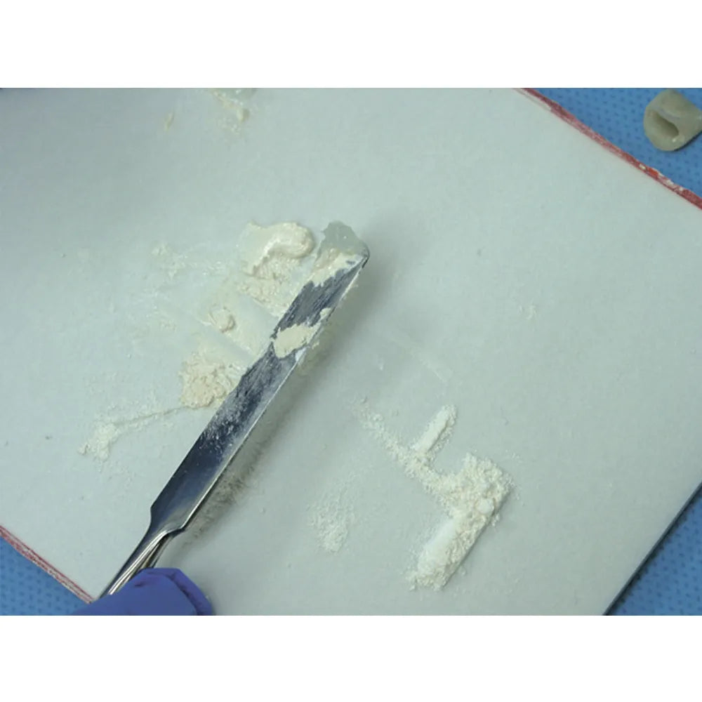 - Cement Mixing: Take the CS5 Cement Spatula and hold it by the handle in a comfortable grip. Place the appropriate amounts of the cement powder and liquid components onto the mixing pad or glass slab according to the manufacturer's instructions.