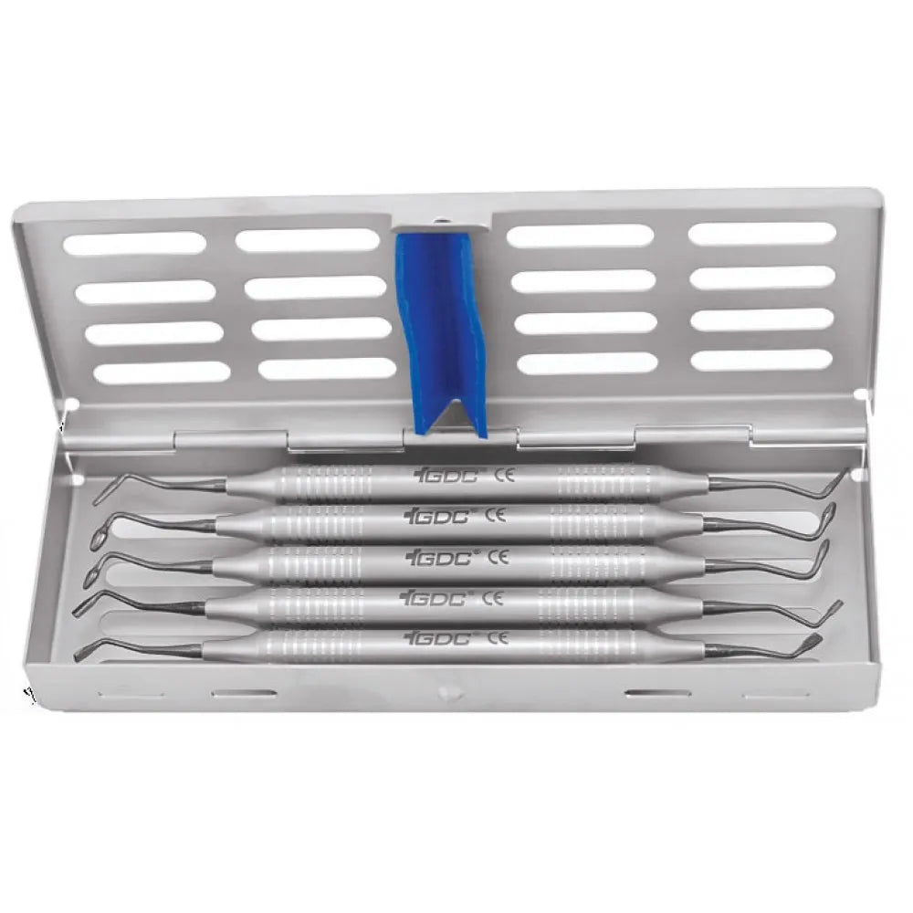 The GDC Composite Instrument Black Coated Posterior Set of 5 Cassette (CIPWC5) is a collection of dental instruments specifically designed for use in posterior composite restorations. The set includes five different instruments, each with a black-coated finish for enhanced visibility and reduced glare during use.The instruments in this set are made from high-quality stainless steel and feature ergonomic handles for comfortable use over extended periods. They are designed to facilitate the placement, shaping, and contouring of composite materials in posterior restorations, with each instrument serving a specific purpose.