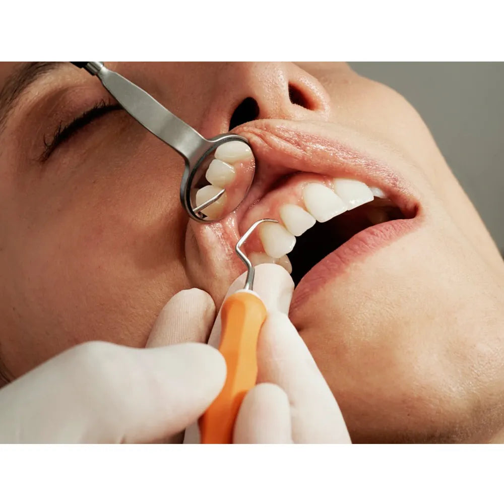 - Double-sided mirror: The mirror has a reflective surface on both sides, which allows the dentist to view different angles of the teeth and gums without having to reposition the mirror.