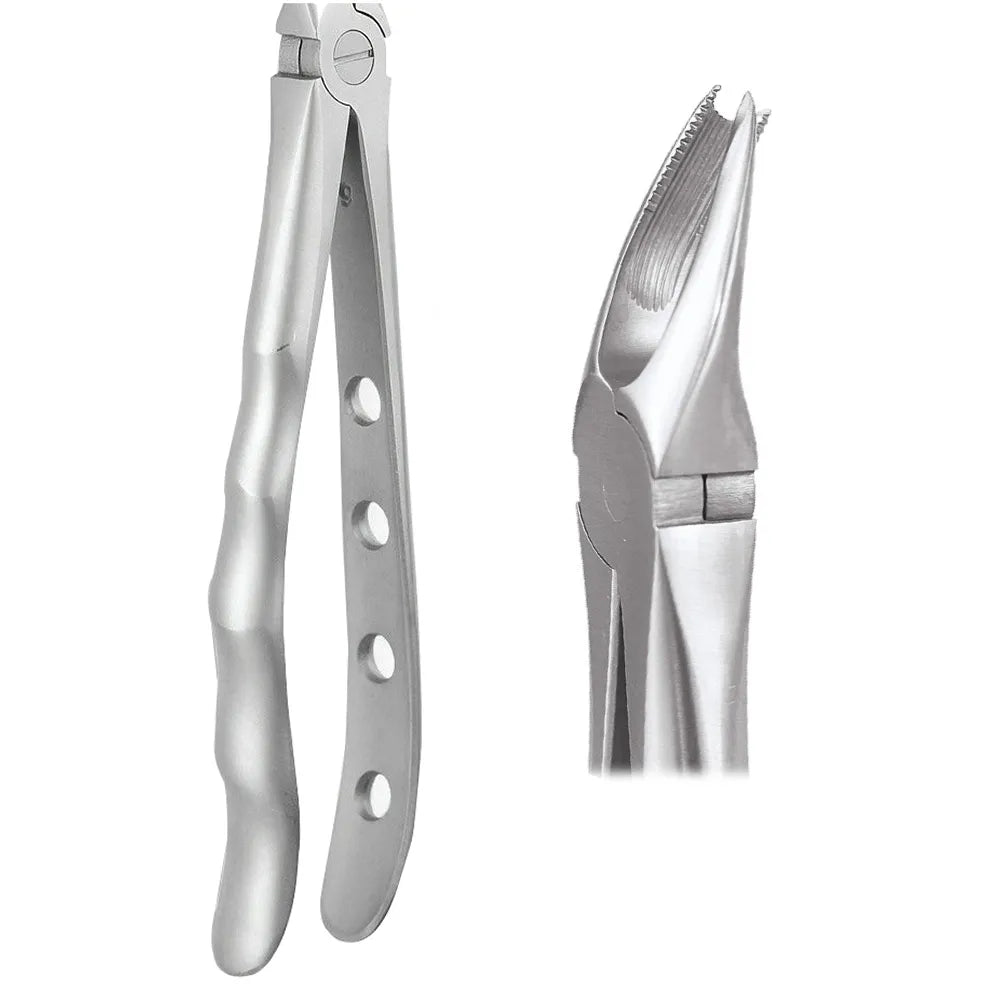 Upper Molars right, Used for dental extraction (also referred to as tooth extraction, exodontia, or exodontics): the removal of teeth from the dental alveolus (socket) in the alveolar bone.