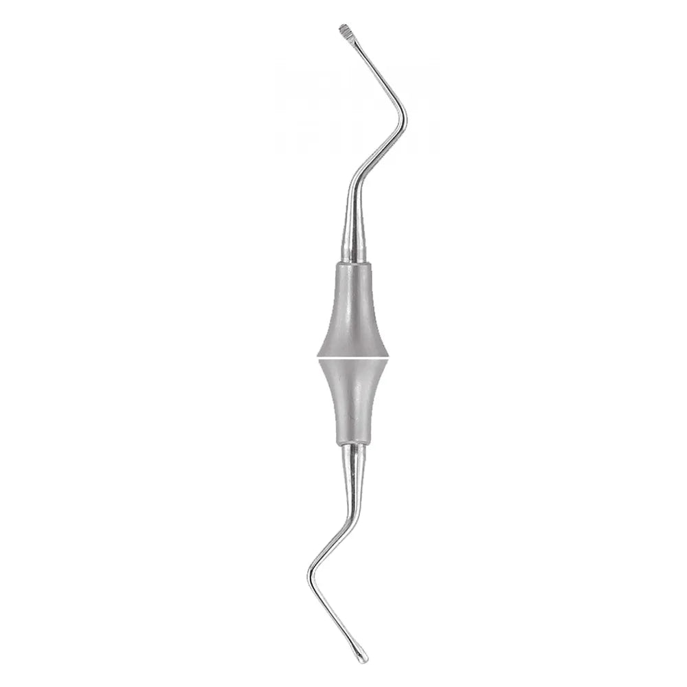 The GDC Hirschfeld file is a type of dental instrument used in periodontal procedures. It is named after its inventor, Dr. Bernhard Hirschfeld, and is commonly referred to as a Hirschfeld curette or periodontal file.The Hirschfeld file is designed with a long, slender handle and a curved, hook-shaped working end. The working end of the file has a rounded tip with a small groove or indentation. The purpose of this design is to allow for effective scaling and root planing during the treatment of periodontal disease. Periodontal files like the Hirschfeld file are used to remove plaque, tartar, and bacterial deposits from the root surfaces of teeth and the surrounding gum tissues. The curved shape of the file enables access to different areas of the mouth and facilitates thorough cleaning of the tooth surfaces.