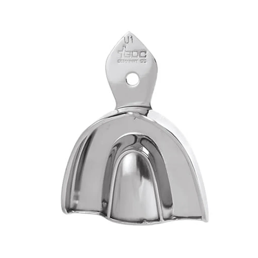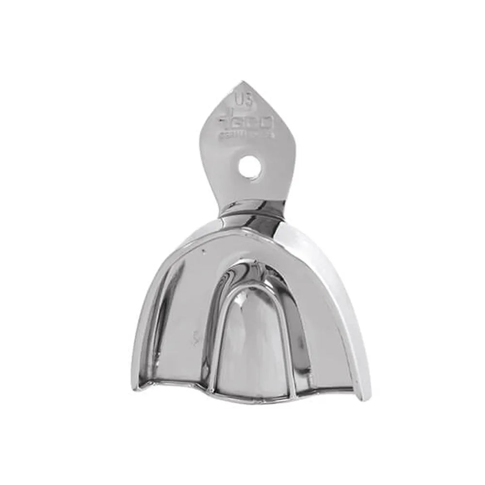 Dental Impression tray Dentulous Non-Perforated is used to take a negative imprint of hard (teeth) and soft tissues in the mouth from which a positive reproduction (cast or model) can be formed. Impression material is of liquid or semi-solid nature when first mixed and placed in the mouth. It then sets to become an elastic solid (usually takes a few minutes depending upon the material), leaving an imprint of person's dentition and surrounding structures of the oral cavity.