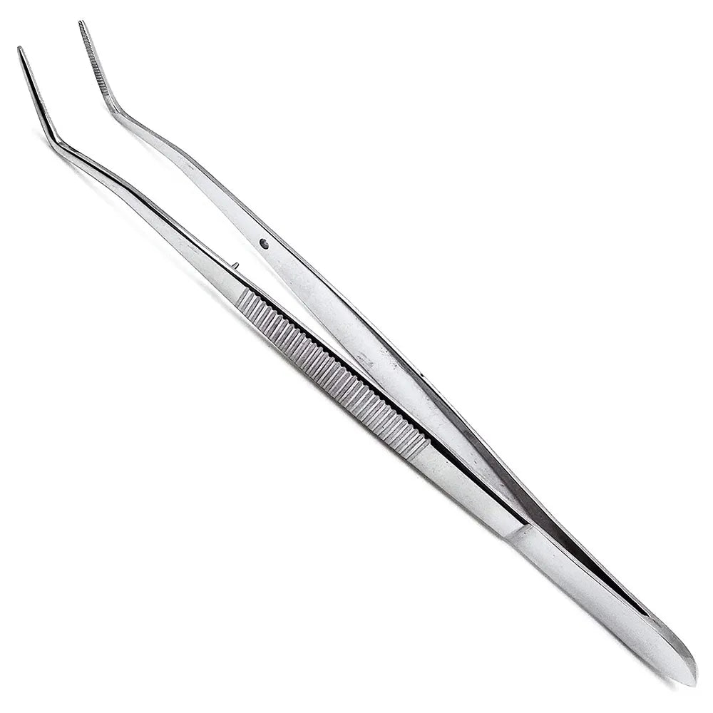 - Marium curved tweezer is the inner serrated type with stainless steel body, angled beak & serrated handles.