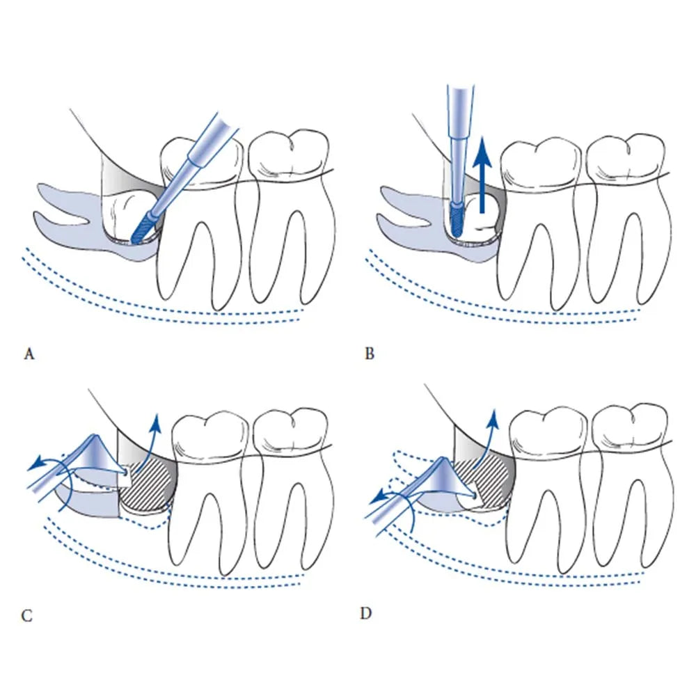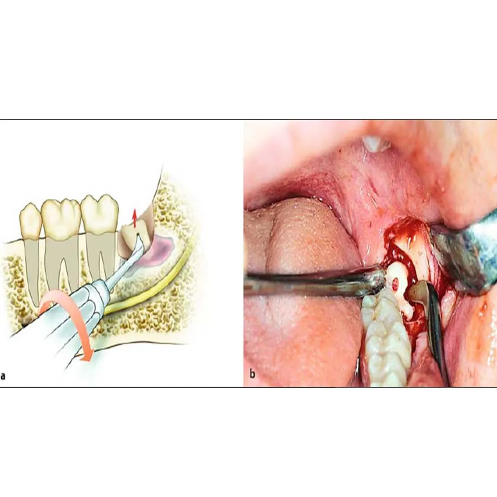 The extraction of the mandibular third molar is the most frequent intervention in oral surgery and it is sometimes associated with less or more severe complications. The choice of surgical instruments is not random but it is an integral part of the method. In addition to standard surgery tools (scalpel, retractor, forceps for tissues, needle holder, rongeur), the tray for surgical extraction of impacted teeth includes some dedicated tools too.