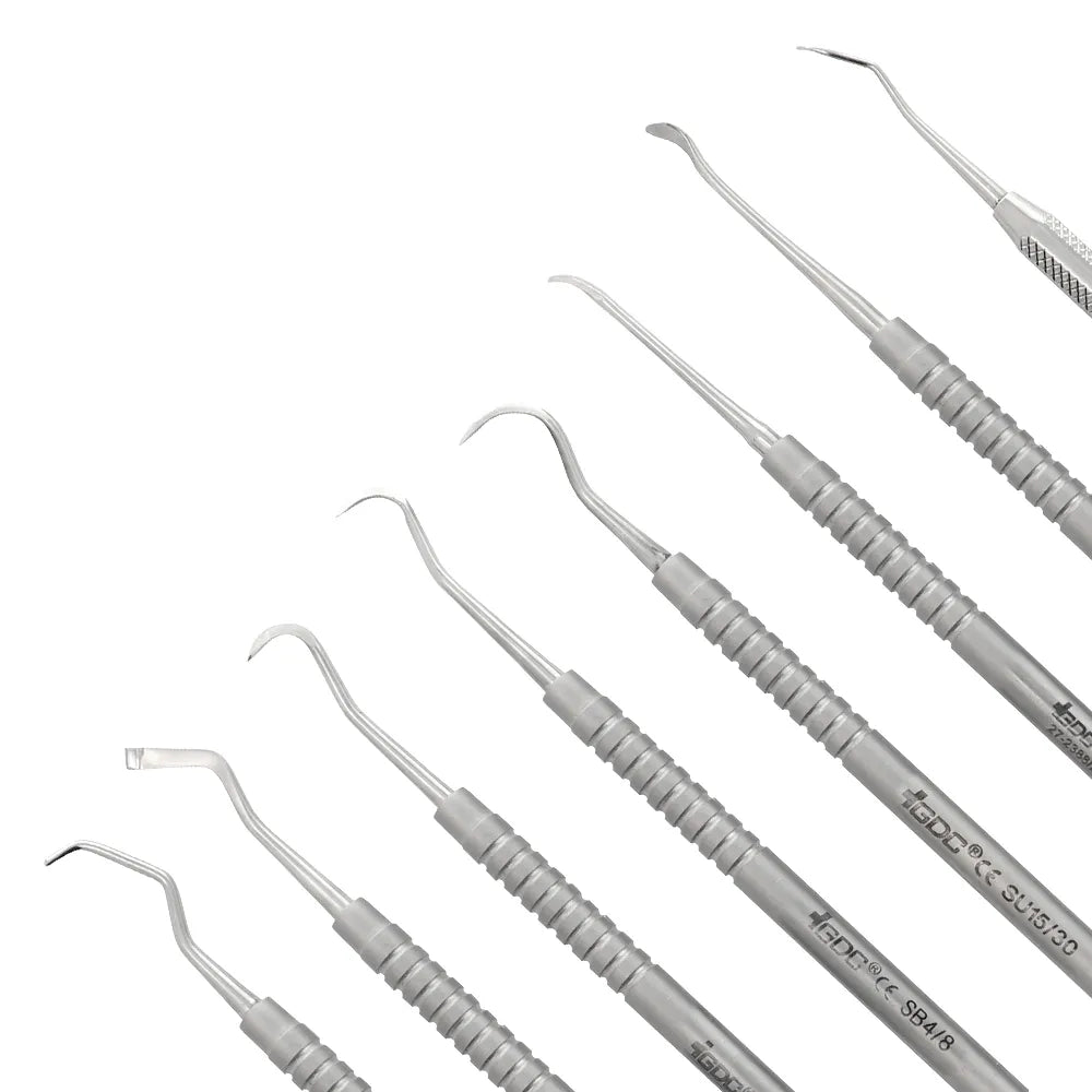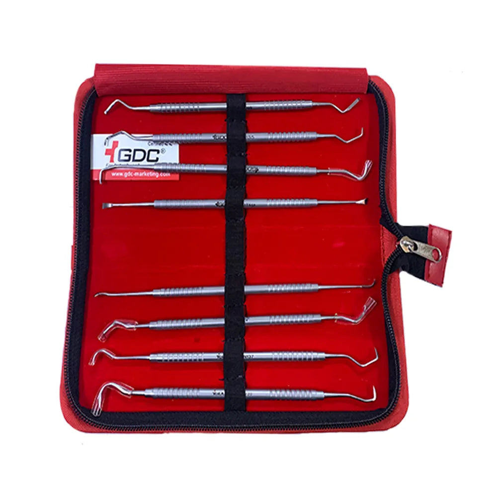 The GDC Perio Scalers Set of 8 (PSP8) likely refers to a dental instrument set used for periodontal (gum) procedures. Dental scalers are tools designed for removing dental plaque, calculus (tartar), and other debris from the teeth and gums. They are commonly used in periodontal therapy to treat gum diseases and maintain oral health.The "Perio Scalers Set of 8" suggests that this set includes eight different types of periodontal scalers. Dental scaler sets often come with various scaler shapes and sizes, each designed to access and clean different areas of the teeth and gums effectively.