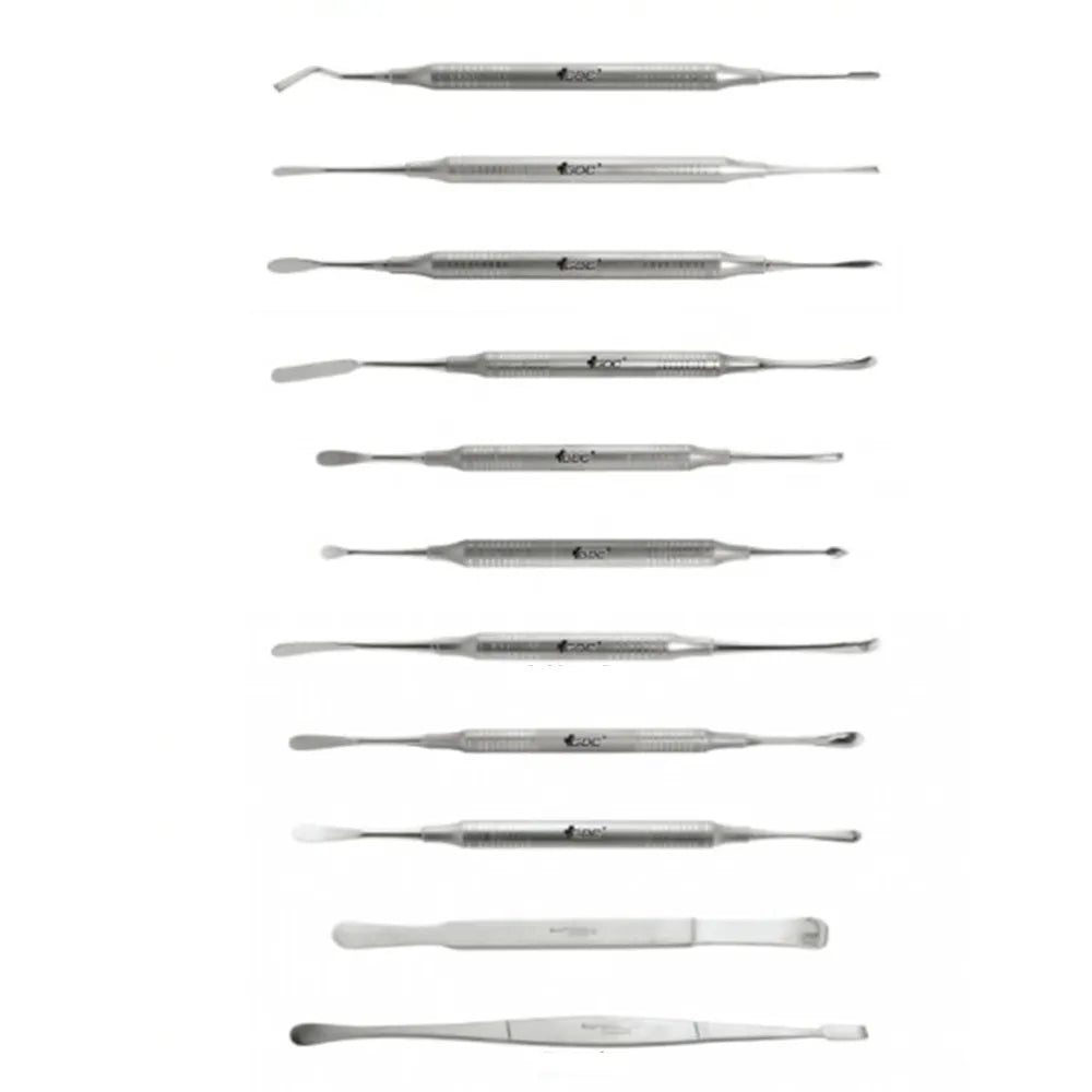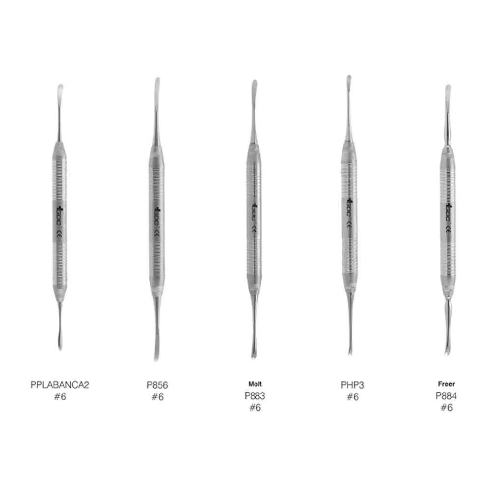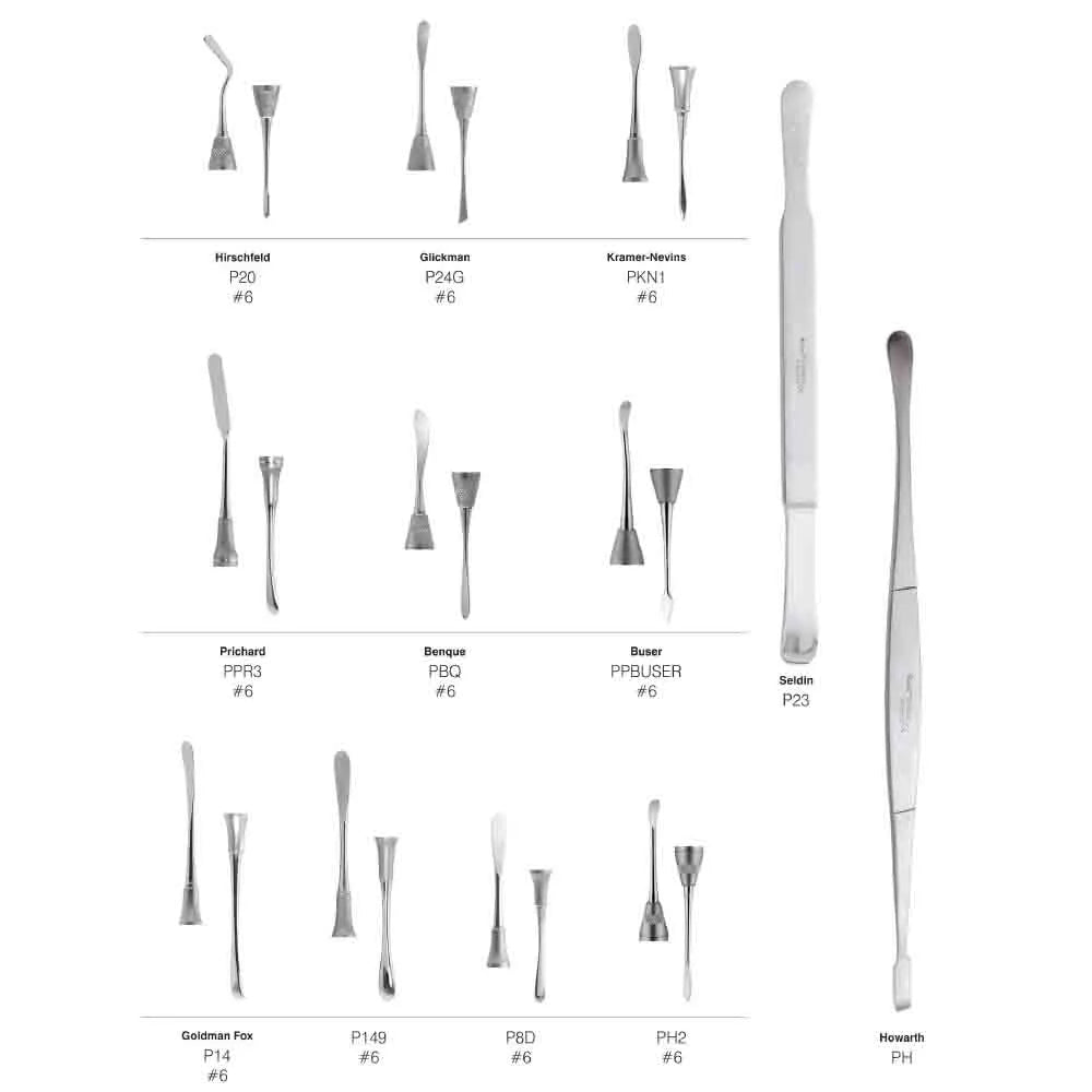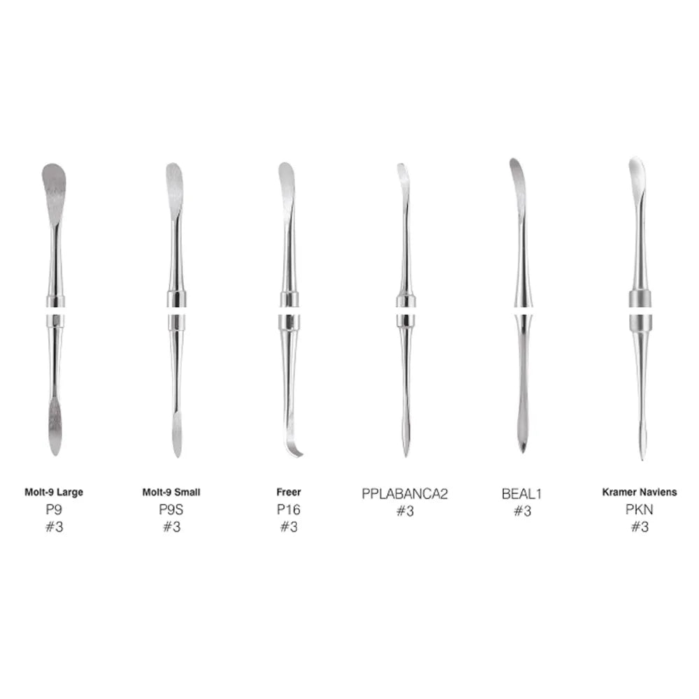 GDC Periosteal elevators are mainly used to lift full-thickness soft tissue flaps. The tips require protection and need to be kept very sharp otherwise shredding of the flap can happen. The most common types in use are the double-ended Molt P9 but also Molt 2 and Molt 4.