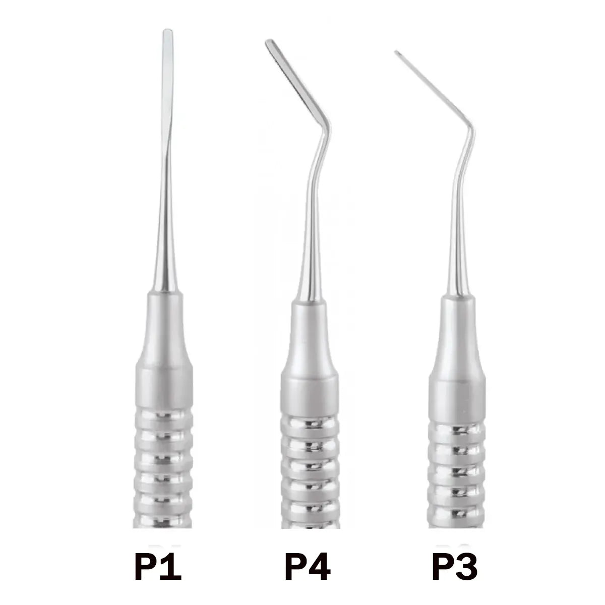 - Set of Three Periotomes: The set includes three periotomes with varying shapes and sizes, each designed for specific procedures and tooth types. This variety ensures versatility in dental procedures.