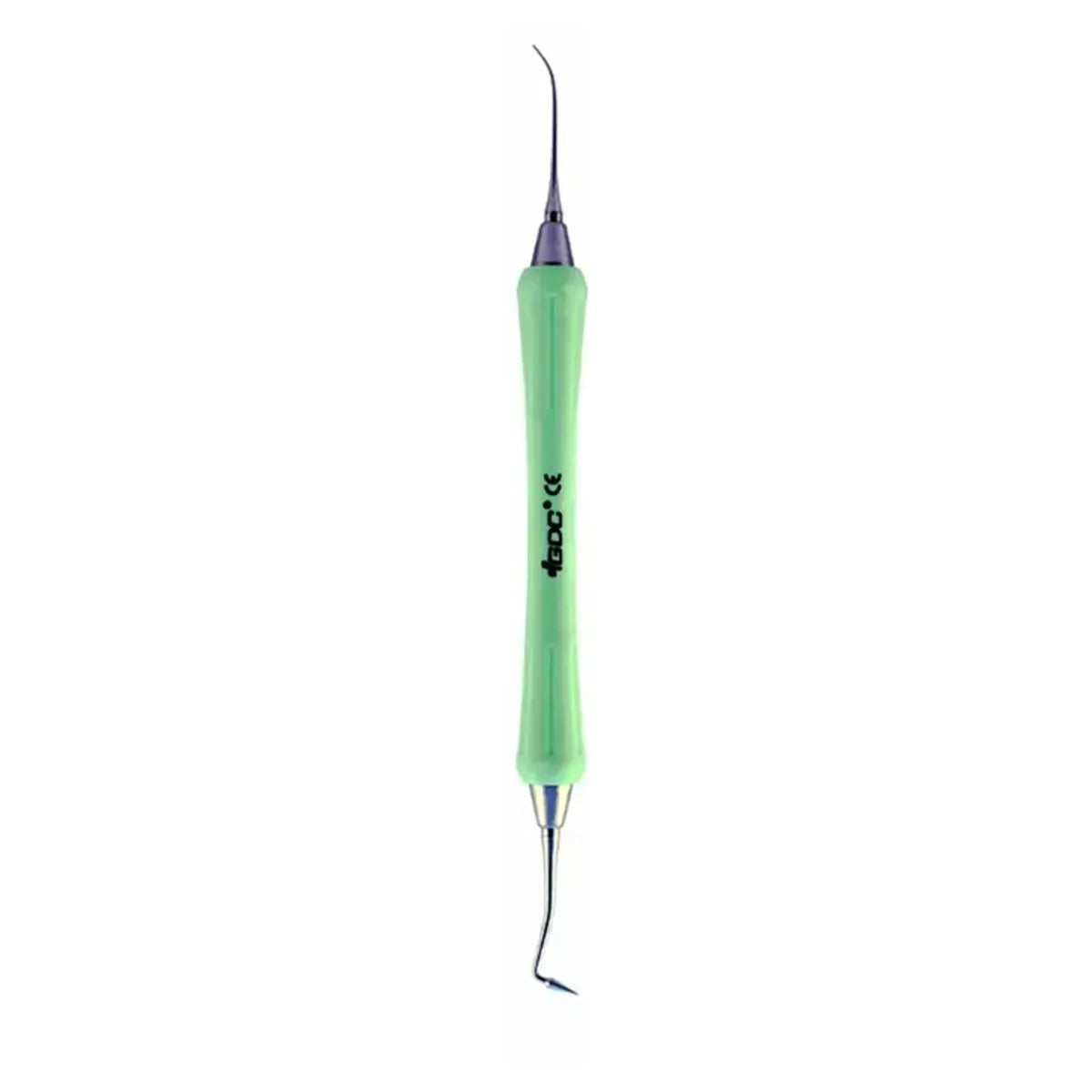 The GDC Restore Instrument - Fissurais a specialized dental tool designed for precise restorative procedures. This instrument features a flexible, reversed, flared design that allows for effective shaping and placement of materials in class III and IV restorations. Its unique design makes it ideal for accessing small pits, fissures, and minor defects on lower anterior teeth. The Fissura instrument is crafted from high-quality stainless steel, ensuring durability and resistance to wear. Ergonomically designed for comfort, it minimizes hand fatigue during extended use. This instrument is essential for achieving optimal results in aesthetic dentistry and restorative applications.