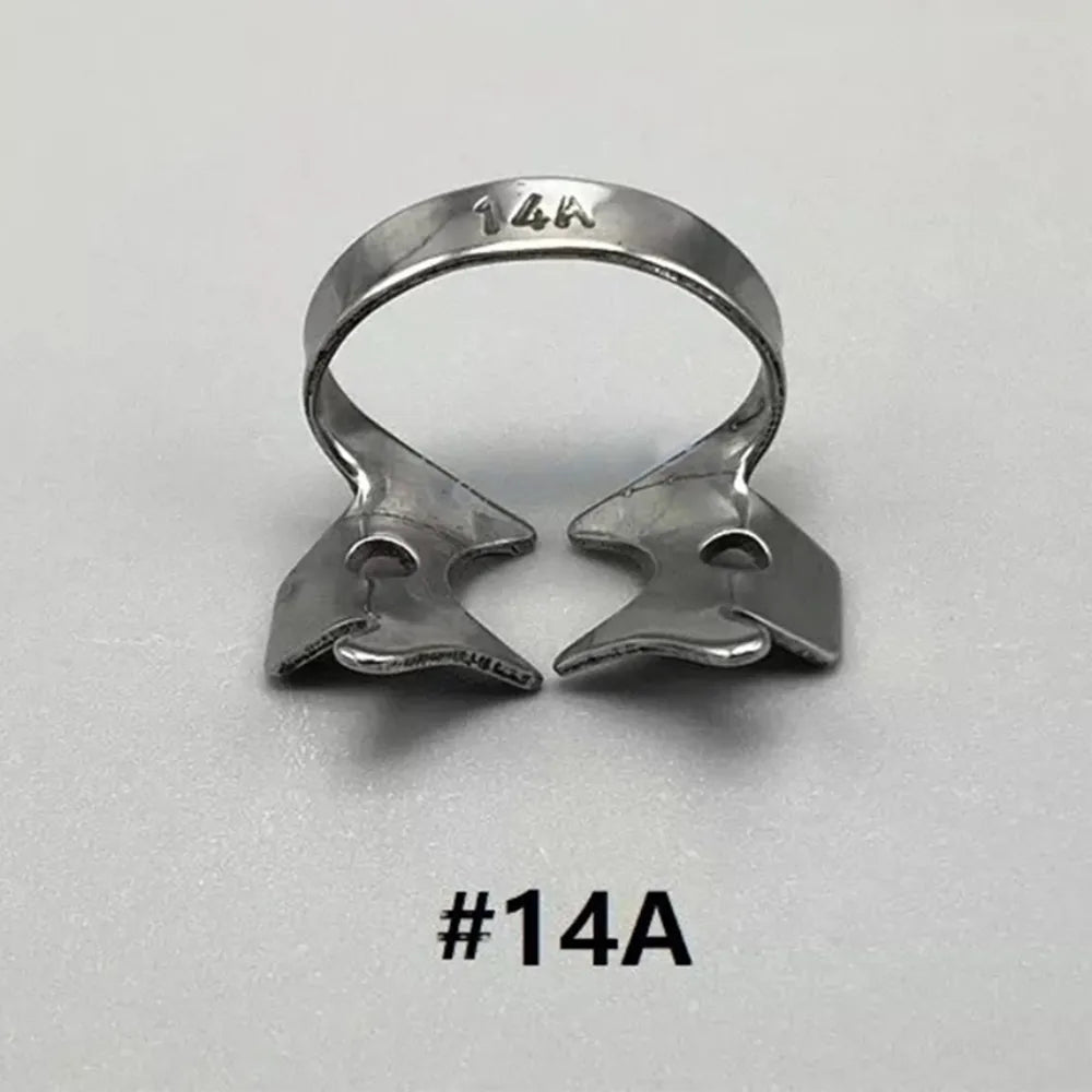 The GDC Rubber Dam Clamp Adult 14a (Rdc14a) is an essential dental tool used to secure a rubber dam in place, particularly in the cervical region of an exposed tooth. Constructed from durable spring metal, it features beveled jaws that effectively grip the tooth surface and a connecting bow. This clamp is designed with festooned jaws to accommodate large, half-erupted, and undersized molars, providing versatility for various dental procedures. With its wide range of applicability, it can be used on multiple tooth numbers, including 1, 2, 3, 14, 15, 16, 17, 18, 19, 30, 31, and 32. The diverse shapes, sizes, and designs available ensure suitability for different clinical scenarios, making it a valuable tool in dental practices for achieving effective isolation and optimal treatment outcomes.