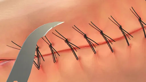 - With a steady hand, gently squeeze the handles together to close the blades and cut through the suture. Apply the necessary amount of pressure to ensure a clean and precise cut.