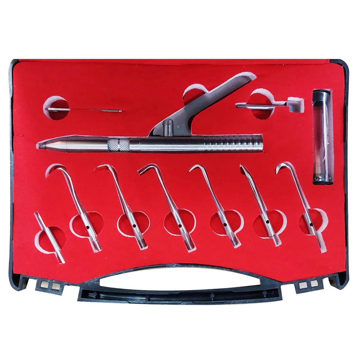 The Crown remover is a spring-loaded mechanical device to remove the bonded crowns and bridges by an intensive impulse. Spring-loaded crown remover with 8 tips and a wrench. Special tip for bridge removing.
