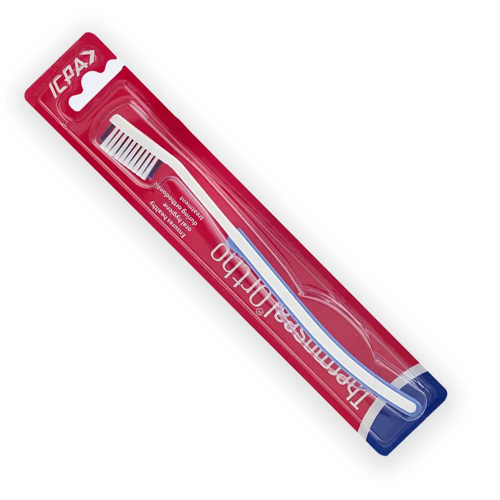 ICPA Thermoseal Ortho Toothbrush is expertly crafted for optimal orthodontic care. Featuring 0.008-inch diameter bristles, it ensures a gentle yet effective cleaning experience. The long outer bristles, measuring 10 mm, are designed to gently massage the gums and clean the tooth surfaces, effectively removing plaque from the gum line. Complementing these are the short inner bristles, with a height of 9.5 mm, which adeptly clean between braces and teeth, ensuring comprehensive oral hygiene. Each bristle is round-ended, providing added protection to enamel and gums, making the Thermoseal Ortho Toothbrush an essential tool for maintaining a healthy and clean orthodontic setup.