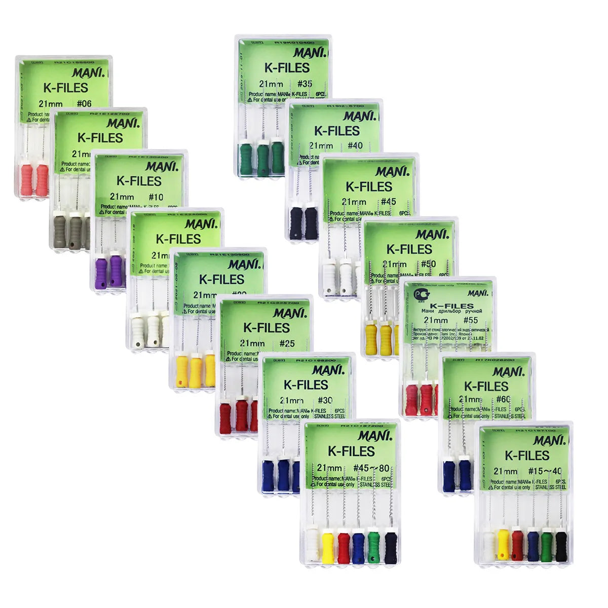 Mani K-Files 21mm are precision dental instruments designed to excel in endodontic procedures, with a particular focus on root canal treatments. Manufactured by the reputable brand Mani, these files feature a specific length of 21 millimeters, making them essential tools for dental professionals. The primary function of Mani K-Files 21mm is to facilitate the thorough cleaning and shaping of root canals. Their slender yet robust design allows dentists to access the entire length of the root canal, ensuring effective removal of debris and meticulous shaping. They are available in various sizes and tapers to cater to diverse tooth anatomies and clinical requirements, providing dentists with versatility and precision. The quality of Mani K-Files is underscored by their construction from high-quality materials, ensuring longevity and consistent performance during dental procedures. Their precision in cleaning and shaping root canals enhances the efficiency of root canal treatments. Furthermore, the files are thoughtfully designed with smooth edges, prioritizing patient comfort during the procedure. Dentists can navigate the intricate root canal system with confidence, ensuring that patients experience minimal discomfort. Mani K-Files 21mm are invaluable instruments in the hands of dentists, empowering them to achieve precise and efficient root canal treatments while prioritizing the well-being and comfort of their patients. Their quality, precision, and versatility make them a staple in the field of endodontics.