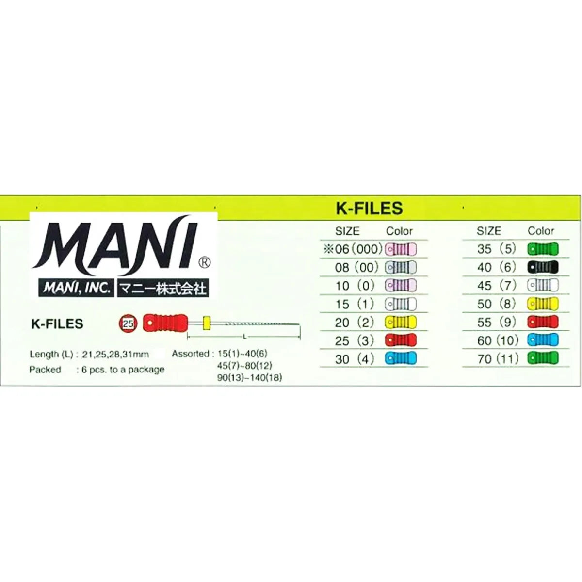 Mani K-Files 25mm are meticulously crafted dental instruments engineered to excel in endodontic procedures, particularly root canal treatments. These files, produced by the reputable manufacturer Mani, possess a defining characteristic—their 25mm length, which plays a pivotal role in their efficacy and versatility.