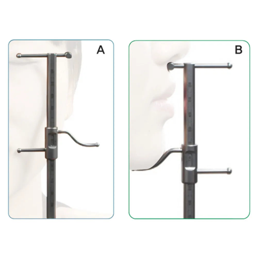 the specific measurement needed. For assessing the distance between the center of the eye and the meeting point of the top lip and bottom lip, choose the side with the two straight arms (A). For measurements between the bottom of the nose and the chin, use the side with the curved chin bar (B). - Measure Eye-to-Lip Distance (Using Straight Arms A): Place the straight arms of the gauge on either side of the patient's face, aligning the center of the eye with the meeting point of the top and