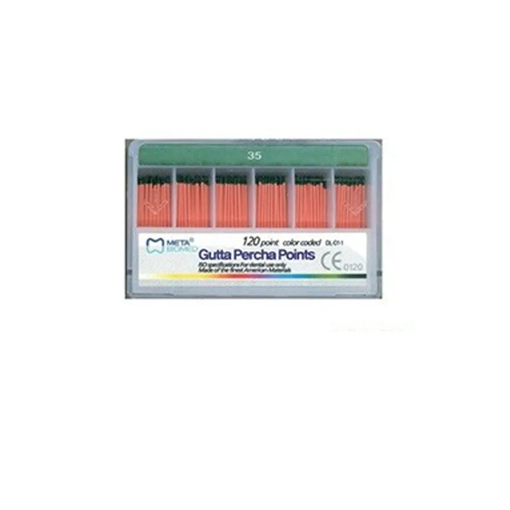 Meta Gutta Percha Points offer a time-saving and efficient solution for root canal obturation, enhancing the overall endodontic process. Designed for easy filling in preparations with files, these points contribute to faster and more convenient procedures. With variable sizes ranging from 15 to 80 and length markings, practitioners can easily adapt the Gutta Percha Points to diverse canal dimensions, ensuring versatility in clinical applications. The excellent radiopacity guarantees clear visibility on X-rays, facilitating accurate assessment and confirmation of obturation quality. The long shelf life and freshness of Meta Gutta Percha Points assure their reliability over time. Suitable for both vertical and lateral condensation techniques, these points provide flexibility in obturation methods. Each box contains 120 points, ensuring an ample and standardized supply for dental practitioners. Meta Gutta Percha Points stand as a comprehensive and dependable choice, streamlining the root canal process for optimal results.