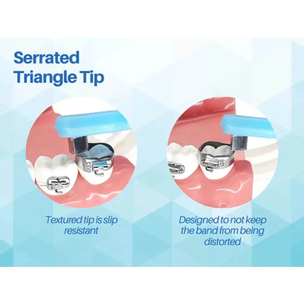 Crafted with meticulous attention to detail, the Band Seater Triangular Tip features stainless steel tips meticulously shaped to optimize the adaptation of orthodontic bands. Its triangular design ensures optimal contact and pressure distribution, facilitating the effortless seating of molar bands during orthodontic procedures. Constructed with durability and longevity in mind, the tips are crafted from high-grade stainless steel, renowned for its exceptional strength and corrosion resistance. Encased in resilient gray nylon, the tips are engineered to withstand bite pressures and the rigors of autoclave sterilization, ensuring enduring performance and reliability. Ergonomically designed, the Band Seater Triangular Tip features a comfortable plastic handle, providing practitioners with a secure grip and precise control during procedures. Its autoclavable design ensures effortless sterilization between uses, maintaining the highest standards of hygiene and patient safety.