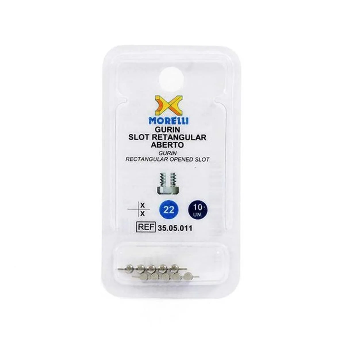 Versatility lies at the core of the Gurin with Open Slot .022". All Gurin variants are meticulously sized to accommodate a wide range of arches, including round, square, and rectangular arches up to .021"x.025" in dimension. This flexibility enables seamless integration into diverse orthodontic setups, offering practitioners unparalleled adaptability and convenience. Packaged conveniently in sets of 10, each Gurin with Open Slot .022" embodies Morelli's commitment to quality and innovation. With its standardized item code (3505011) and precise specifications, including a 0.56mm open slot, this product stands as a testament to Morelli's dedication to excellence in orthodontic instrumentation.