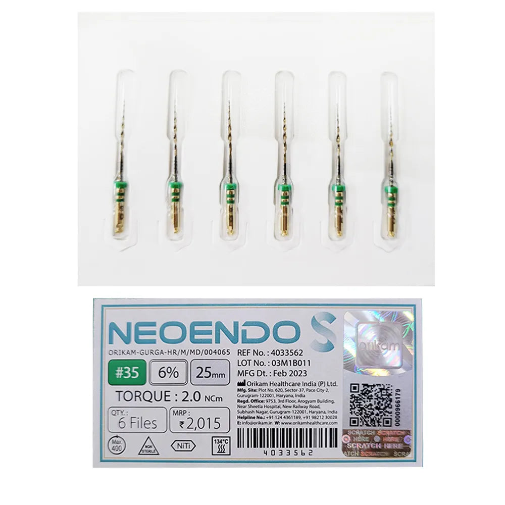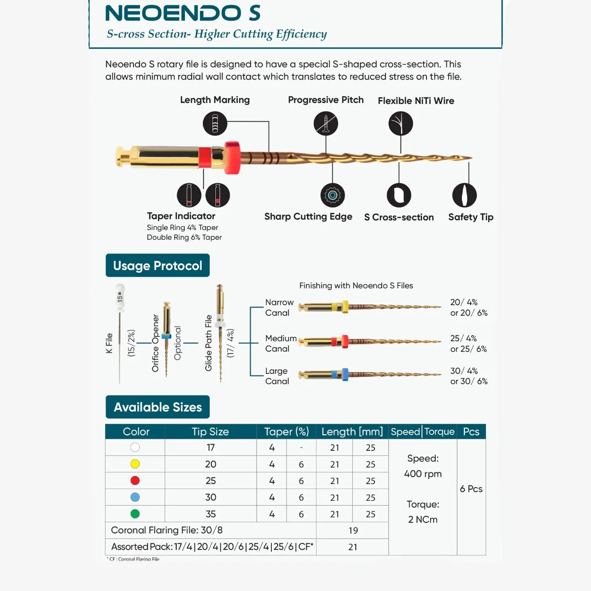 Neoendo S rotary file is designed to have a special S-shaped cross-section. This allows minimum radial wall contact which translates to reduced stress on the file. In addition, the excellent upward debris auguring ensures that the debris isn’t pushed apically or packed into the apical third. Further, proprietary heat treatment ensures that the file remains highly flexible and resistant to fracture.