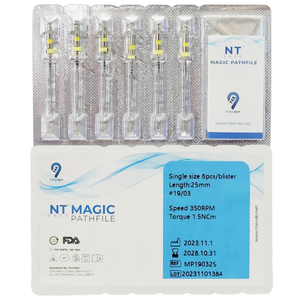 NT Magic Pathfilesare specialized rotary Nickel Titanium (NiTi) instruments meticulously engineered to create a smooth glide path in the field of rotary endodontics. What sets them apart is their superior ability to preserve the original anatomy of root canals, surpassing traditional manual stainless steel files. This preservation is vital for the success of root canal treatments. The exceptional flexibility of NT Path Files is a standout feature, thanks to their unique metallurgical composition and a small taper size of 3%. This combination allows them to effortlessly navigate the intricate twists and turns of even the most curved and narrow root canals. What makes these files truly remarkable is their capacity to significantly reduce the risk of complications such as lodging and transportation. Their unmatched flexibility ensures that the root canal procedure becomes not only more manageable but