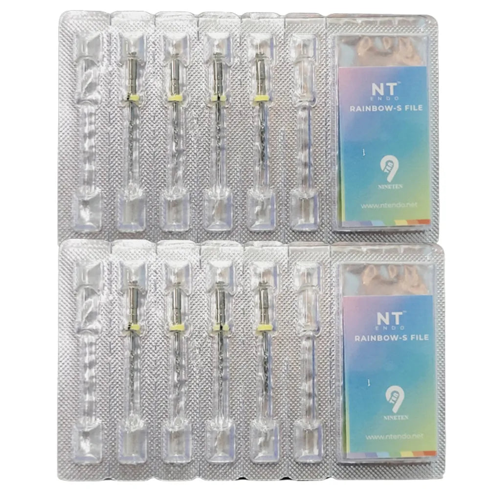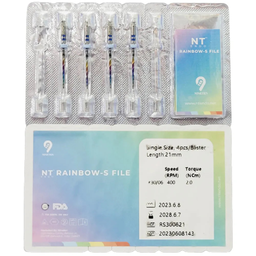 NT Rainbow S NiTi Rotary Filesare advanced rotary tools designed for efficient root canal preparation. Crafted from high-quality nickel-titanium alloy, these files undergo precise heat treatment and surface enhancement processes, combining flexibility with durability. One key feature is their innovative heat treatment and surface therapy, which minimizes crack propagation, enhancing resistance to cyclic fatigue. Their slim S-shaped cross-section offers exceptional flexibility, facilitating navigation through curved root canals while efficiently transporting debris and reducing preparation time. The files boast an inactive tip design that ensures safe preparation, reducing the risk of perforations and zipping. Their variable pitch design enhances mechanical resistance, reducing the risk of tip fracture. Moreover, their unique property of retaining a pre-curved shape at room temperature allows for easy customization. Available in various lengths and sizes, each file is conveniently marked with its taper value on the handle. With a recommended speed of 400 RPM and a torque of 2 NCm, NT Rainbow S files are the choice for precise, safe, and efficient root canal procedures.