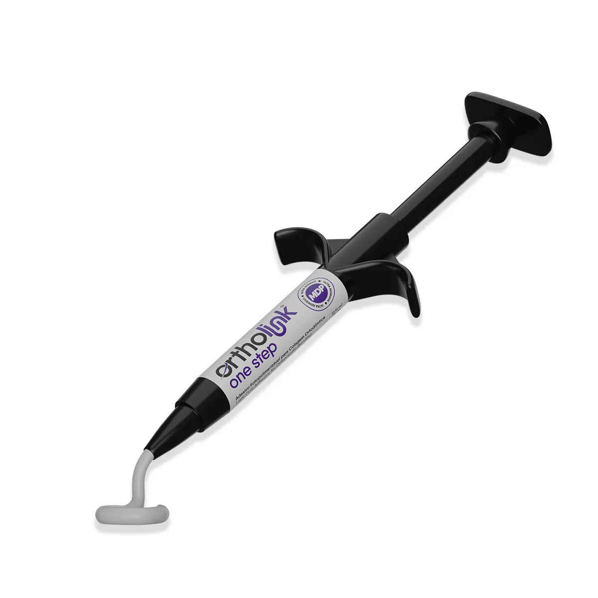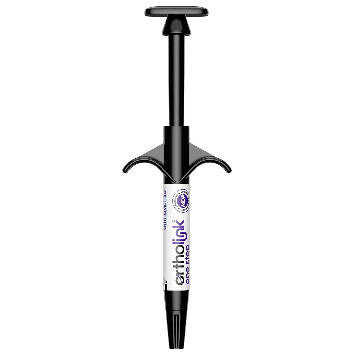 OrthoMetric Ortholink One Step Adhesive - (85.20.0904) is designed to directly bond metal, ceramic, and polycarbonate orthodontic brackets to dental surfaces. Its advanced formulation combines methacrylic monomers and high-performance fillers, ensuring superior adhesive strength and optimal handling. The inclusion of a fluorescent UV tracer aids in identifying excess adhesive for easy removal, minimizing the risk of enamel damage. Additionally, the fluoride content helps prevent cavities and strengthens tooth enamel. With a self-adhesive formula, it eliminates the need for separate dental adhesives, streamlining the application process. This adhesive provides immediate bonding strength, allowing for quick wire insertion, and ensures stability before photopolymerization, making it an essential tool for orthodontic practices. Its versatility and durability make it suitable for various bracket types.