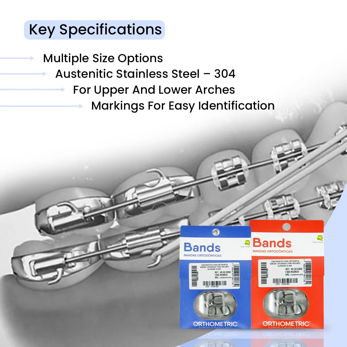 OrthoMetric Plain Ortho Bands, meticulously engineered for optimal orthodontic performance. Crafted with precision, these bands boast an anatomical design that ensures a superior fit to the tooth anatomy, promoting comfort and stability throughout treatment. Designed with smooth, burr-free edges and a superior finish, OrthoMetic bands prioritize the preservation of enamel integrity during both insertion and removal, minimizing the risk of damage. This attention to detail extends to the reduction of plate retention, facilitated by the thoughtful design of the parts, enhancing patient comfort and convenience. Available in a range of sizes from 34 to 40.5, and compatible with both upper and lower quadrants, OrthoMetric Plain Ortho Bands offer versatility and ease of use. Their easy identification streamlines the orthodontic process, enabling efficient application and adjustment of orthodontic accessories like tubes, hooks, buttons, brackets, and orthopedic appliances. Choose OrthoMetric for precision, comfort, and reliability in orthodontic care.