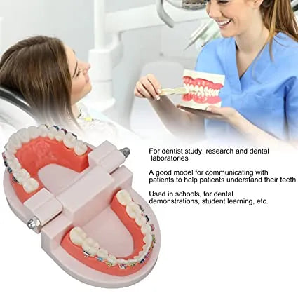 Patient Education Model With Orthodontic Brackets is crafted from high-quality materials, ensuring durability and precision. It features metal brackets for a realistic representation, making it ideal for dentist education and research purposes. Perfect for patient demonstrations, it aids in explaining orthodontic procedures, appliance usage, and treatment outcomes. The model serves as a valuable tool for both academic and clinical environments, enhancing understanding and communication in orthodontic practices. Its detailed construction ensures a professional appearance, reinforcing its use as an effective educational resource.