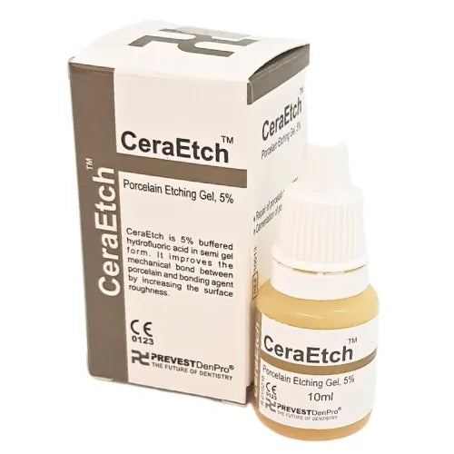 CeraEtch is 5% Buffered Hydrofluoric acid in semi gel form. It improves the mechanical bond between porcelain and bonding agent by increasing the surface roughness.