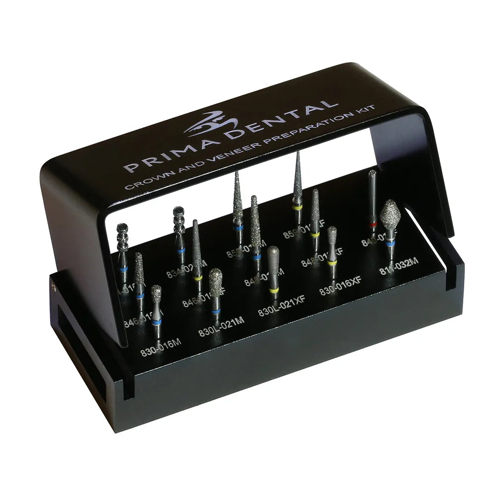 Prima Crown & Veneer Preparation Kit includes 14 FG Burs. This set offers accurate tooth preparation for a wide range of crown and bridge restorations, veneers and onlays.