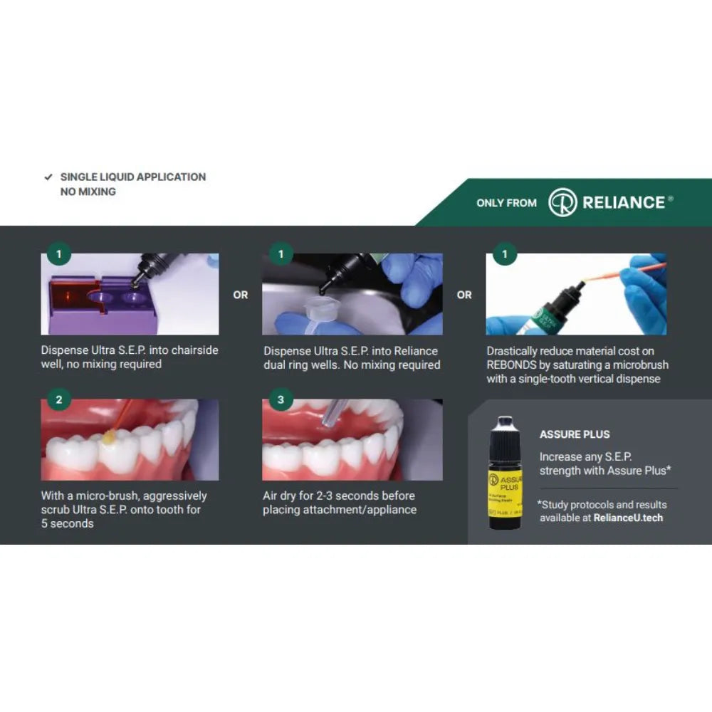 Reliance Orthodontics introduces its groundbreaking Ultra S.E.P., a solution that revolutionizes enamel preparation by seamlessly merging etching and priming into a single step. With a swift five-second liquid application, it streamlines the process, eliminating the need for premixing or rinsing. This innovative primer not only saves valuable time but also reduces material costs, enhancing efficiency in orthodontic practices. Offering comprehensive enamel preparation for bonding, it proves effective for various procedures including rebonding, occlusal build-ups, and optimizing band-cement retention. Its versatility extends to emergency repairs, providing orthodontic professionals with a reliable solution for unexpected situations. Ultra S.E.P. represents a significant advancement in orthodontic technology, promising convenience, cost-effectiveness, and exceptional performance, thus elevating standards in enamel preparation and bonding procedures.