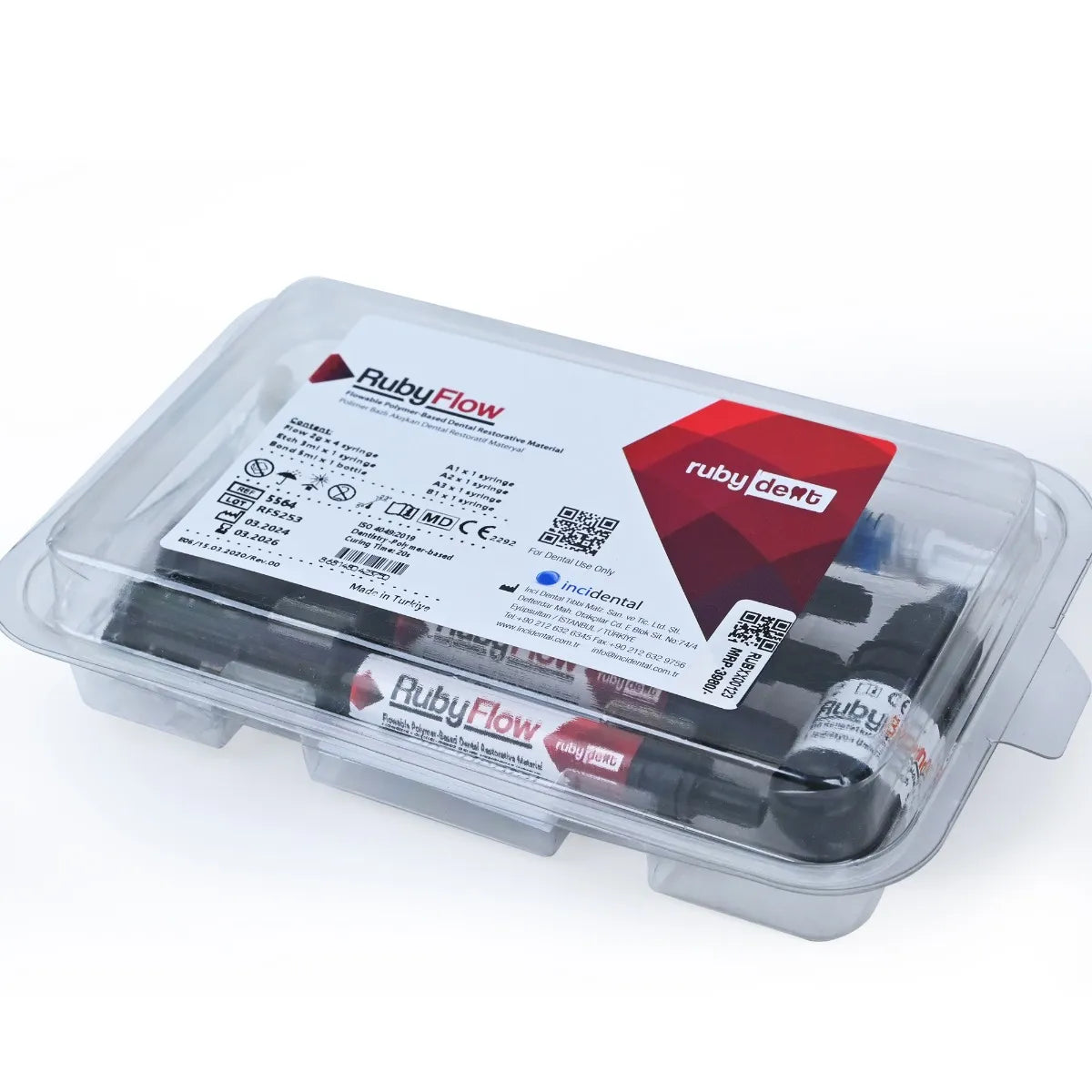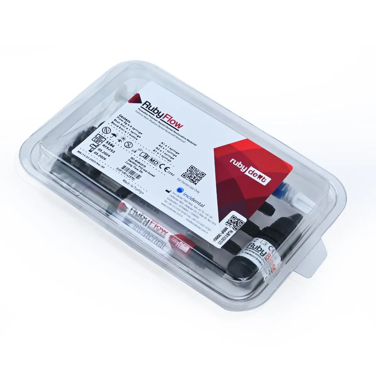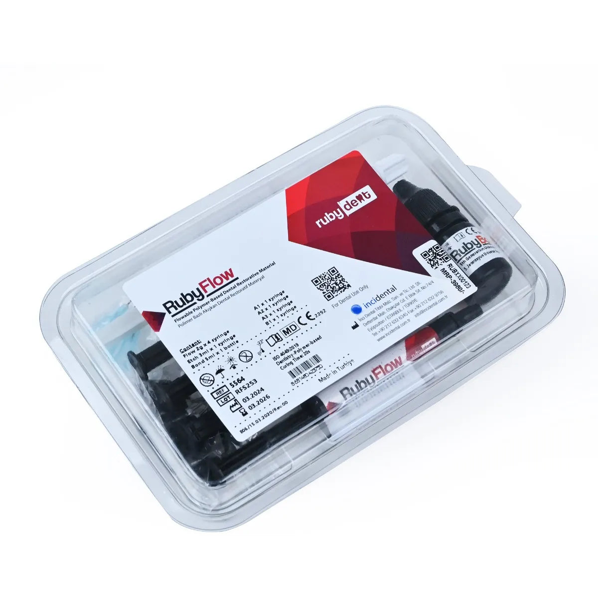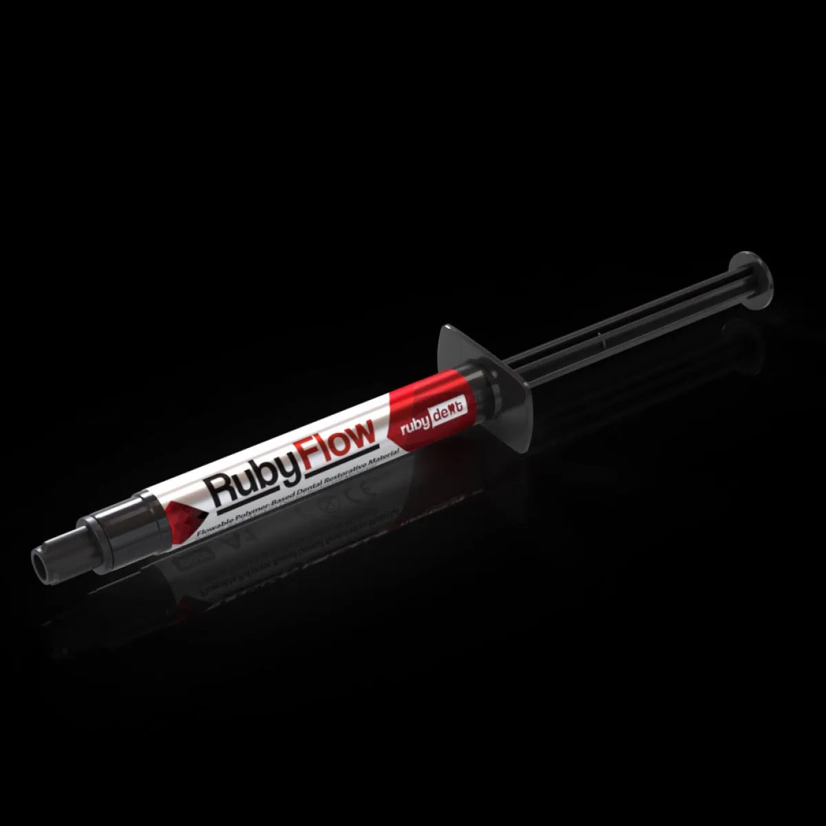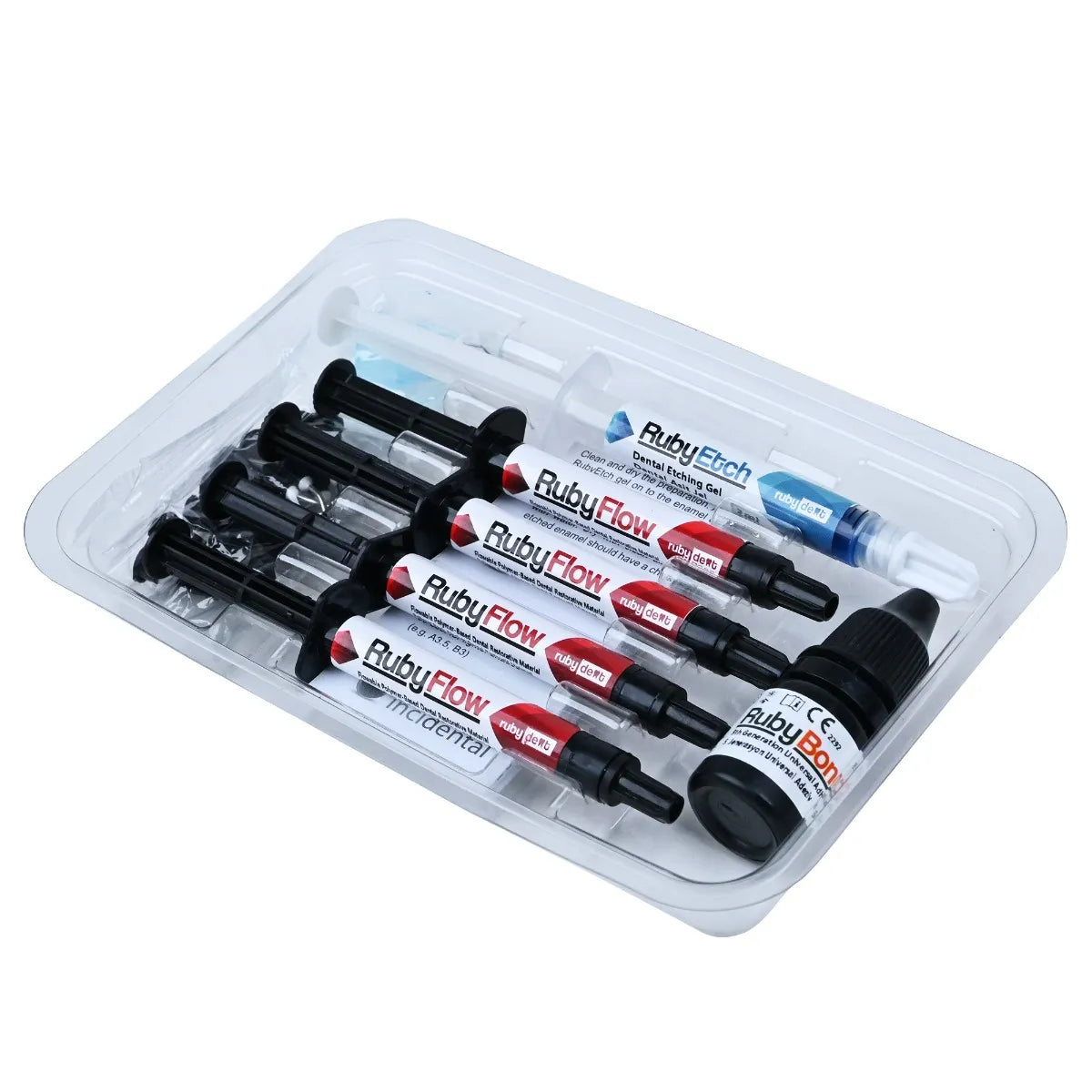 Rubydent RubyFlow Flowable Composite Kit combines three essential components for efficient and aesthetic dental restorations: RubyBond 5th Generation Universal Adhesive, RubyEtch Denbal Etching Gel, and RubyFlow Composite.