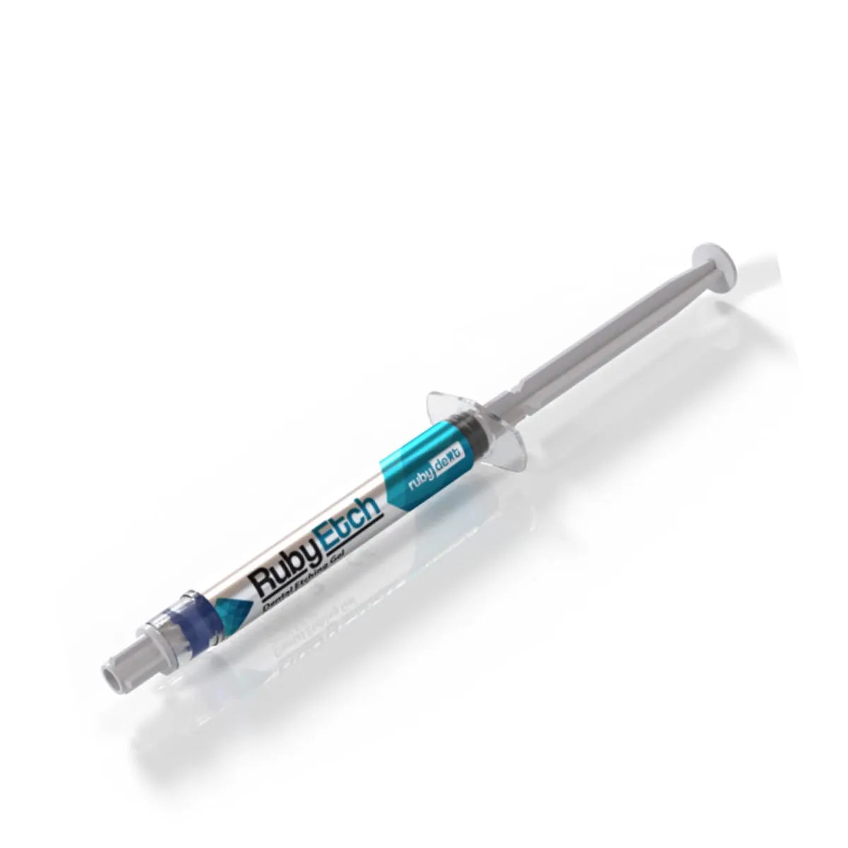 RubyEtch Denbal Etching Gel: With a composition containing 37% phosphoric acid, RubyEtch is designed for precise enamel etching. It comes with thin application needles for accuracy and leaves the etched enamel with a chalky white appearance, ensuring proper adhesion of restorative materials.