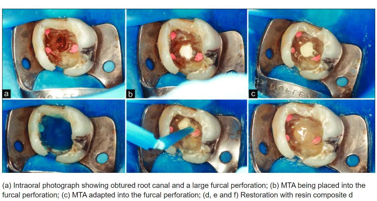 For retrograde filling of a tooth root apex under anesthesia you should provide access to a tooth root apex (dissect a mucous supra-bony flap), carry out root apex resection and with the help an ultrasonic tip with special diamond hand piece to form a cavity for retrograde filling. After maintenance of hemostasis the cavity in a tooth root apex is filled by the received paste. It is necessary to replace the bone defect with the osteoplastic product, the flap is fixed by the suture. - For Perforation Closure