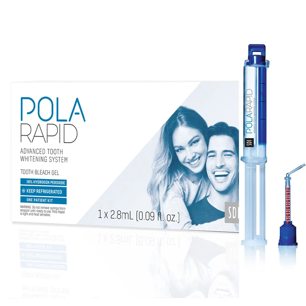 The SDI Pola Rapid Advanced Tooth Whitening System is a professional in-office whitening treatment designed to deliver fast and effective results. Featuring a unique formulation with 38% hydrogen peroxide, Pola Rapid safely whitens discolored vital and non-vital teeth in just 45 minutes. The system utilizes a high-viscosity gel that adheres well to teeth, ensuring efficient application and easy removal.Pola Rapid is designed for simplicity, requiring no mixing, as the dual barrel syringe system combines the components during application. It also includes built-in desensitizers, such as potassium nitrate, to minimize post-operative sensitivity while providing a calming effect. The fluoride-releasing formula helps strengthen teeth, making it suitable for patients with sensitivity concerns.Additionally, Pola Rapid can be used with or without a bleaching light, offering flexibility for dental practitioners. This system is backed by years of research and clinical success, making it a reliable choice for effective tooth whitening.