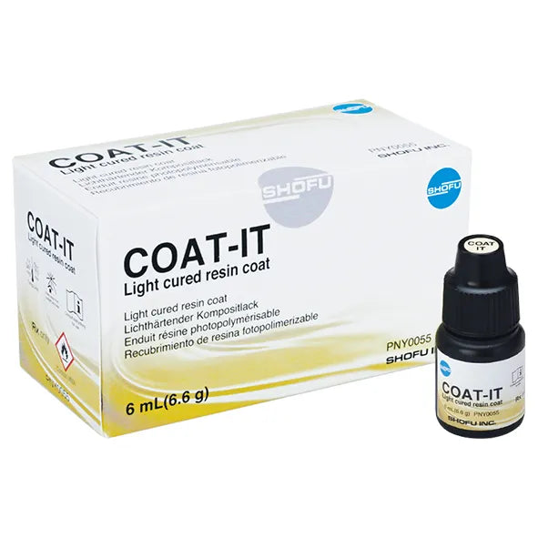 Answer: Remarkable Surface Gloss - COAT-IT is easily and completely cured to a natural gloss with both LED and Halogen light curing sources within 10 seconds, leaving very little residual uncured monomer.Exceptionally Strong Bond - COAT-IT exhibits an equally strong adhesion to different substrates such as Enamel, Dentin and GIC, with virtually no gap, even when observed under high magnification.