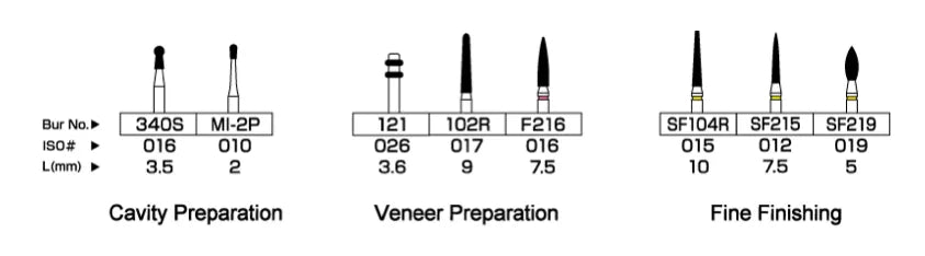 - Diamond Point FG # 121: for precise depth orientation grooves to achieve uniform labial reduction