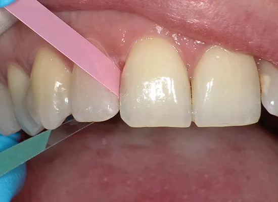 - Place the strip on the restoration surface and apply light pressure to ensure that the abrasive coating makes contact with the surface.