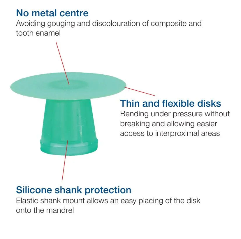 Each color-coded grit serves a specific purpose in the finishing and polishing process. The Black disks are designed for contouring, allowing for easy removal of excess restorative material and shaping of the restoration. The Violet disks are used for finishing, smoothing out any rough areas and preparing the surface for polishing. The Green disks are for polishing, providing a smooth, shiny surface to the restoration. Finally, the Red disks are for superpolishing, giving the restoration a high-gloss finish.