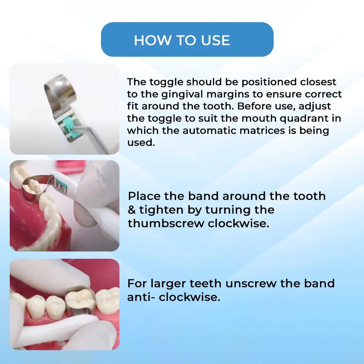 - Fit the band around the tooth and tighten by turning the thumbscrew clockwise. Do not over tighten. For larger teeth, unscrew the band anti-clockwise.